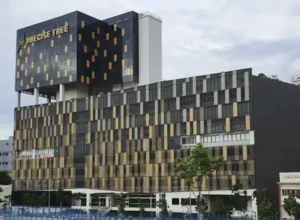 Precise Tree at 55 Kim Chuan Drive is an 11-storey industrial building serving as the headquarters for Precise Development Pte Ltd. The modern facility features a steel and glass curtain wall with perforated metal screening adhering to the Defence Science and Technology Agency’s (DSTA) visual screening requirements. The building employs post-tensioned flat slabs supported by reinforced concrete columns and walls, optimising structural efficiency and interior space.